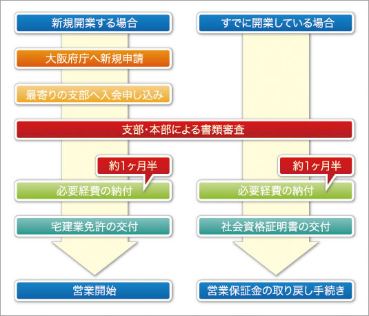 不動産を開業する場合に義務づけられている営業保証金(主たる事務所1000万円、その他の事務所500万円)が免除され、弁済業務保証金分担金として、主たる事務所60万円その他の事務所30万円で開業できます。詳しくは、(一社)大阪府宅地建物取引業協会大阪本部または当支部へお気軽にお問い合わせください。